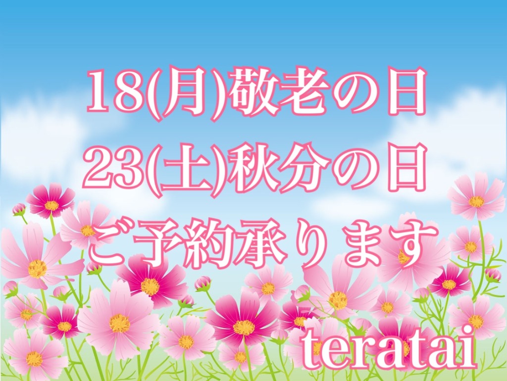 来週は祝日が続いていますが、terataiは休まず営業しております☆彡